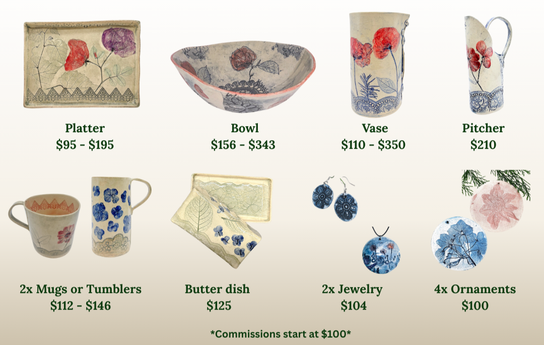 Commission orders are an opportunity to create custom clay pieces that tell your unique story. You can use your own fabric materials, favorite plants or flowers, choose the colors you want, and engrave meaningful phrases or dates on your ceramic piece(s). We love bringing personal meaning to your every day objects.